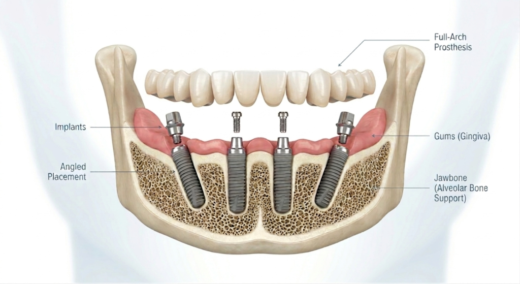 The procedure involves placing implants into strategic areas with the strongest bone support, often at precise angles to maximize stability.