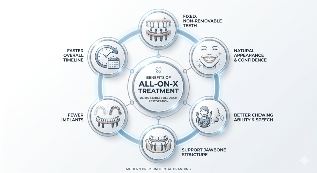 All-on-X is an advanced dental implant solution that replaces a full arch of missing teeth using a limited number of implants, depending upon the case and situation.